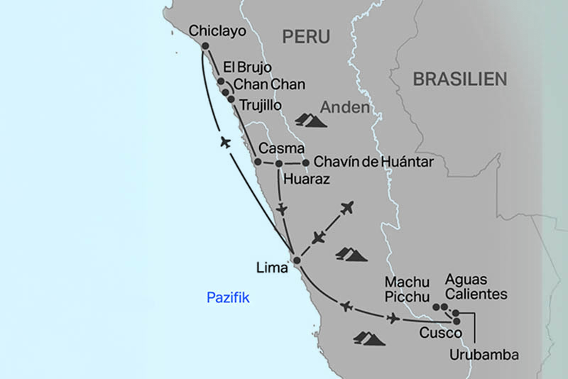 Von den ältesten Zeremonialzentren an der Pazifikküste bis zur geheimnisvollen Inkastadt Machu Picchu: Diese Reise führt zu den grossen Kulturen Perus. Im Norden besuchen wir die Prunkgräber der Moche, das UNESCO-Weltkulturerbe Chavín de Huántar und bedeutende Museen. Im Süden erwarten uns Cusco, das heilige Tal der Inka, die Salzterrassen von Maras und die sagenumwobenen Ruinen hoch über dem Urubamba-Fluss.