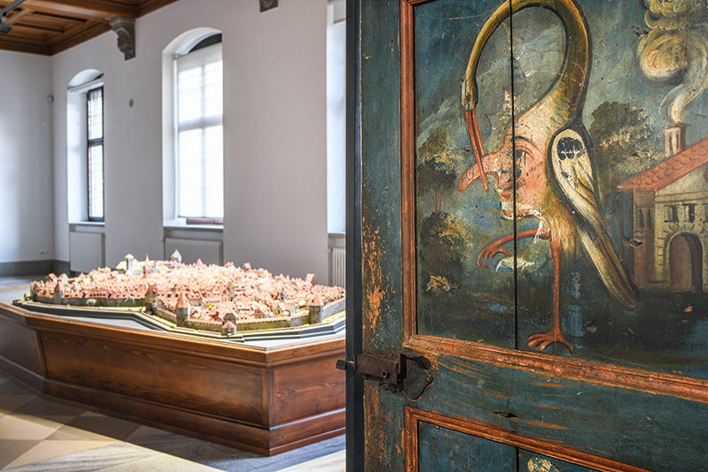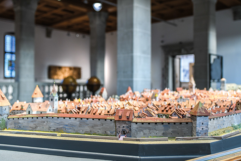 Sich selbst zu erkennen und in ausgewählten Kulturerzeugnissen wiederzufinden, wird auch Thema des neuen Hauptsaals im ersten Stock sein. Die Architektur des 100-jährigen Museums im Stadtpark führt die Gäste vom repräsentativen Foyer über die Prunktreppe zum grosszügigen Hauptsaal. Hier steht neu das grosse Stadtmodell, Herzstück der historischen Sammlung. Es zeigt St.Gallen um 1642 und stellt eine Verbindung zur Stadtgeschichte her. Flankiert wird es von einigen der ältesten archäologischen Fundstücke des Kantons St.Gallen einerseits und einem der wertvollsten Beispiele aus der ethnologischen Sammlung andererseits, eine Figur aus Nordchina, gleichzeitig Zeichen der kulturellen Vernetzung von Ost und West über die alte Seidenstrasse. Diese ausgewählten Stücke aus den drei Abteilungen werden ergänzt von einer spätgotischen Uhr als Symbol der Zeit und Vergänglichkeit sowie zwei Globen. Die Erd- und Himmelsgloben aus der Frühneuzeit wie das Stadtmodell sind die ältesten Hinweise auf die Sammlungsgeschichte; sie zierten einst als Prunkstücke die Bibliothek der freien Reichsstadt St.Gallen, Vorgängerin der städtischen Museen.